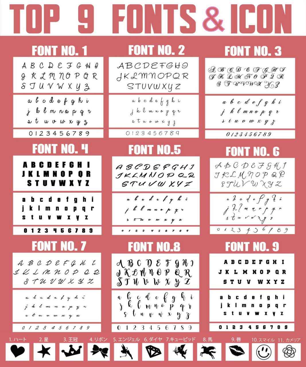 商品画像と共に掲示のフォントサンプルをご確認頂いた上で、ご希望のフォントをお知らせ下さい